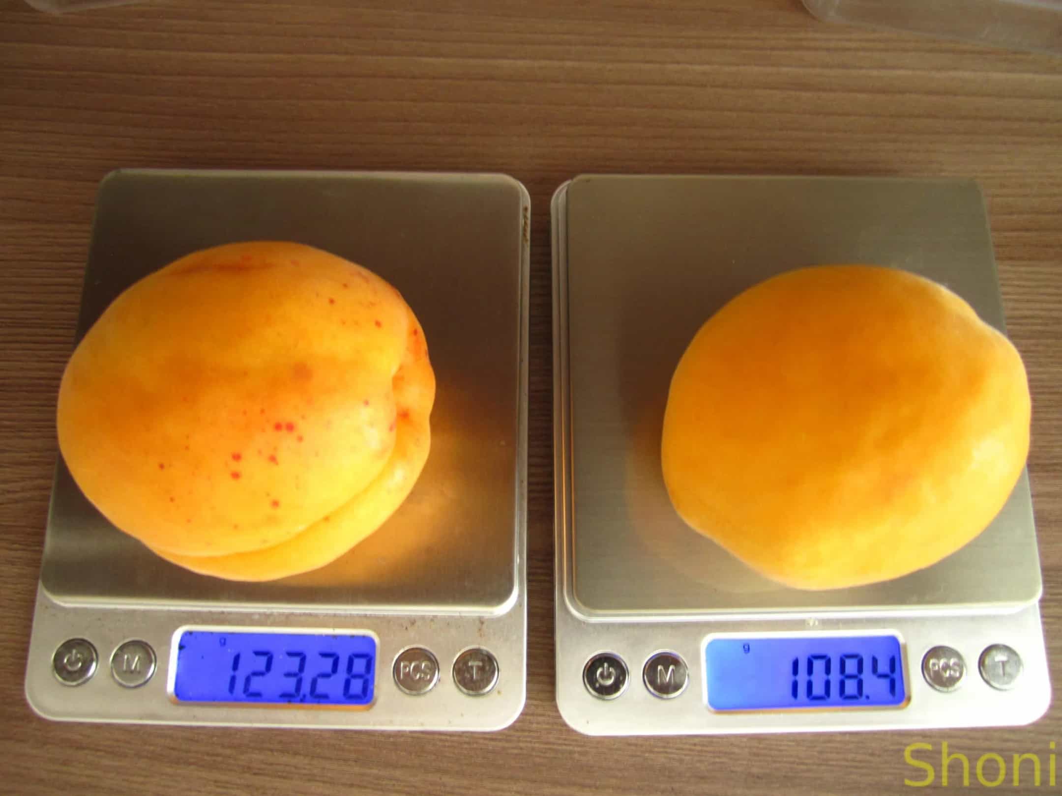 Середня вага плодів – 185 - 210 грамів. Вони округлі, мають жовте забарвлення з насичено червоним рум'янцем. М'якоть легко відділяється від кісточки, плоди чудово підходять як для вживання у свіжому вигляді, так і для консервації.
