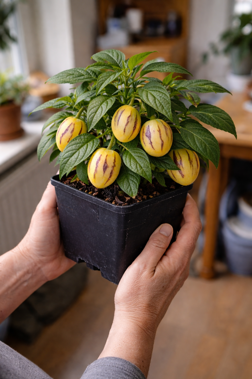 Чесно — не вірила, що пепіно може родити в квартирі. Але “Рума” здивувала. Перші плоди зняла ще минулого сезону, а цього року вже вдруге збираю. Стоїть на підвіконні, нічого складного не роблю — полив і світло. Плоди солодкі, реально смачні.
